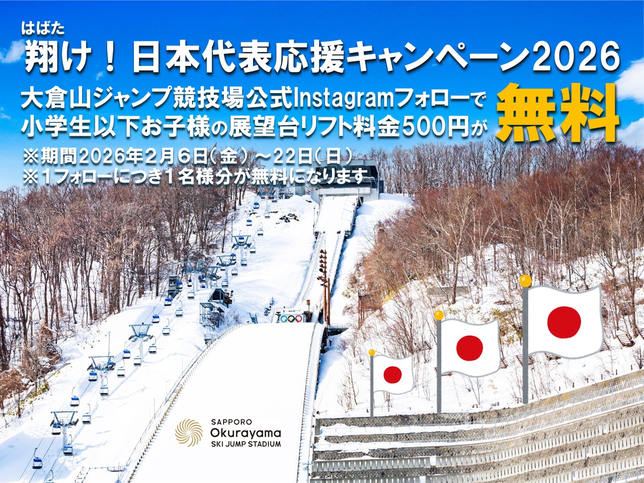 大倉山ジャンプ競技場では、『 翔(はばた)け!日本代表応援 キャンペーン2026 』と題しまして、